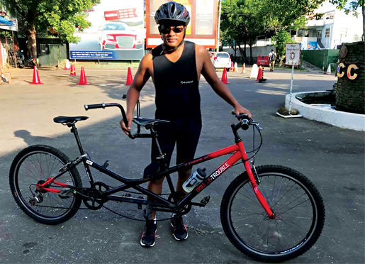 He began training for the Ironman six weeks ago, swimming under the coaching of renowned coach Julian Bolling, and running and cycling with French expat Denis Crassier. He is accompanied and guided throughout the competition’s events by Shaki Edirisinghe, who interestingly has a hearing impairment. They train on a daily basis, with Khalid travelling to Colombo after work for 1.5 km of swimming at the NCC pool, then 10 km of running and cycling on the road around Torrington, usually getting back to his home in Kolonnawa at about 10:30 p.m.