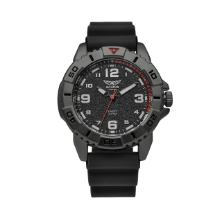 For adventurers: robust materials with precise craftsmanship! Discover the rugged AIRBORNE model from the Aviator F Series, which impresses with its use of solid materials. The sand-textured dial, raised white indices, and green fluorescent hands are set within a 46 mm case, featuring a rotating bezel for easy flight time calculation. The stainless-steel case back and clasp emphasize the solid quality of this watch. The premium, 22 mm wide silicone strap is extremely comfortable to wear and underscores the functional style. Equipped with a reliable quartz movement and water-resistant up to 3 bar.