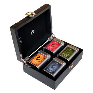 A four slot recyclable gift tea box featuring mini caddies of the Original Earl Gray, Brilliant Breakfast, Prince of Kandy and Ceylon Silver Tips White tea. An ideal collection of gift teas for the discerning tea aficionado.